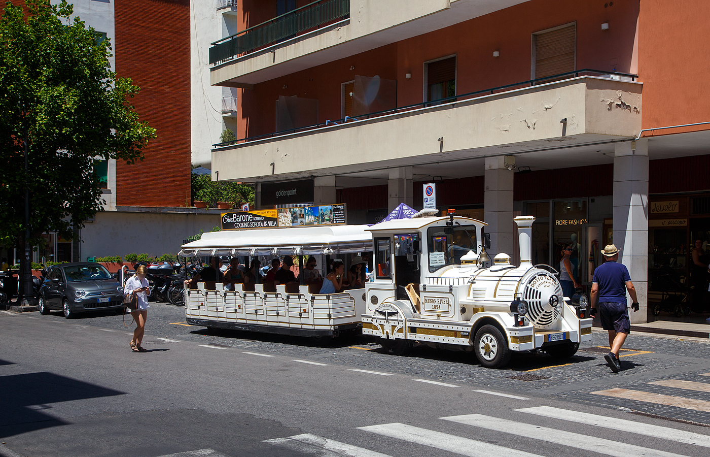 Ein Petit Train (ein Muson River 1894 vom italienischen Hersteller DOTTO TRAINS mit einem Anhänger) am 15.07.2022 Sorrent (Sorrento).