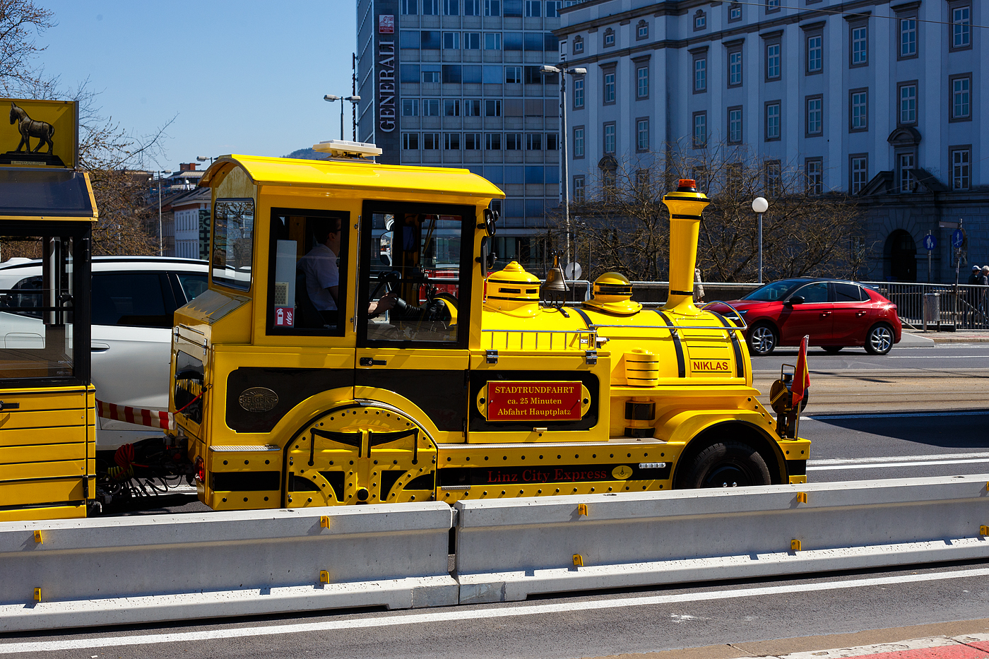 Ein Petit Train, gezogen von „Niklas“ einem Muson River 1894 vom italienischen Hersteller DOTTO TRAINS mit 3 Anhänger, des Geiger´s Linz City Express am 04 April 2025 erreicht bald von der Donau überspannenden Nibelungenbrücke kommend den Hauptplatz Linz.